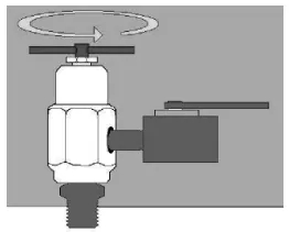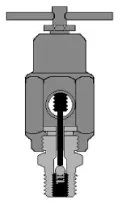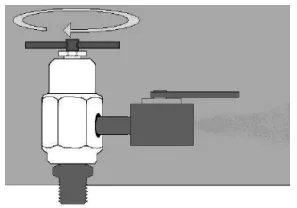 將SO-BV工具連接到注脂嘴上之前,首先逆時針旋轉(zhuǎn)SO-BV工具上的T型手柄使頂桿上行至最大位置,然后拆除密封注脂接頭上的金屬蓋帽,將SO-BV工具連接在注脂接頭的螺紋上并旋緊。然后順時針旋轉(zhuǎn)SO-BV工具上的T型手柄,頂桿下行,使得注脂接頭內(nèi)的球形止回閥“離座”,可以使得閥體內(nèi)的物質(zhì)通過泄放孔和后端的閥門被釋放出(如下頁圖7)。