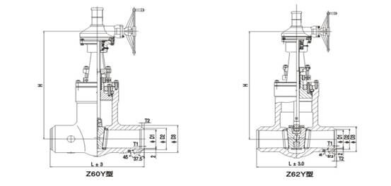 集團(tuán)生產(chǎn)的Z61Y-250、Z61Y-320 型高壓電站閘閥:手動、對接焊連接形式、明桿楔式剛性單閘板,閥座密封面材料為硬質(zhì)合金,公稱壓力 PN250~PN320,閥體材料為碳素鋼的高溫高壓電站閘閥。
